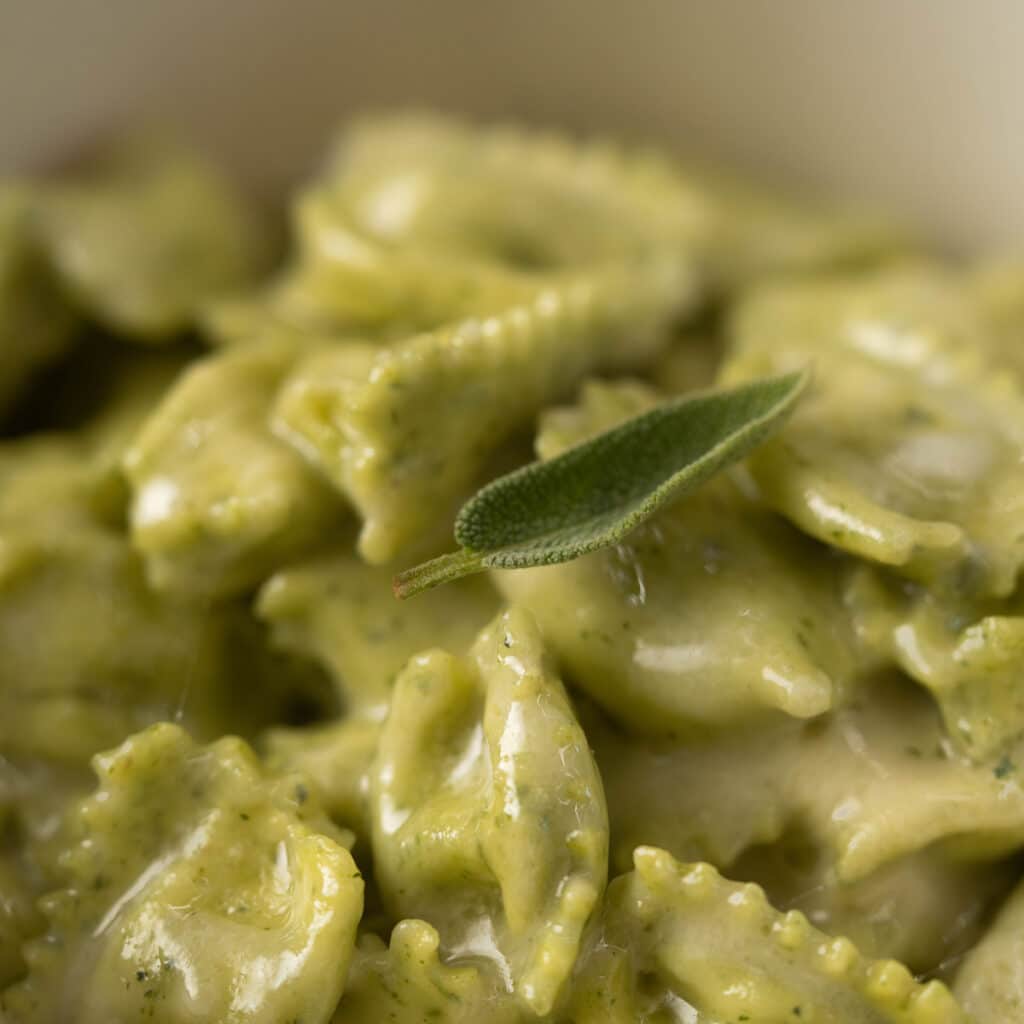 Il nostro Plin vegetariano, con fonduta di formaggi, ricotta e spinaci freschi.