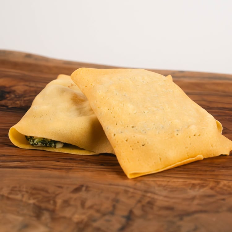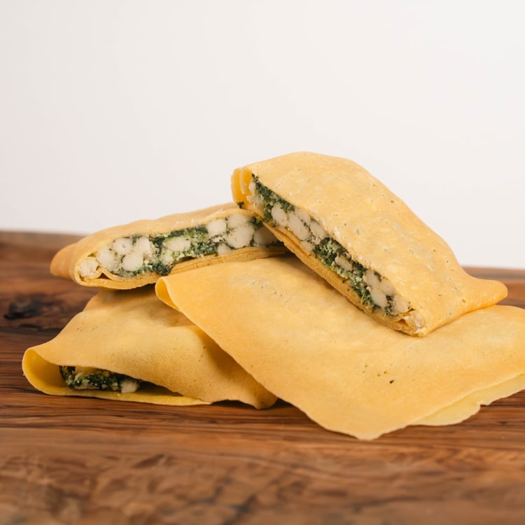 Crepes fatte a mano ripiene di spinaci e mozzarella filante. Da gratinare al forno.
