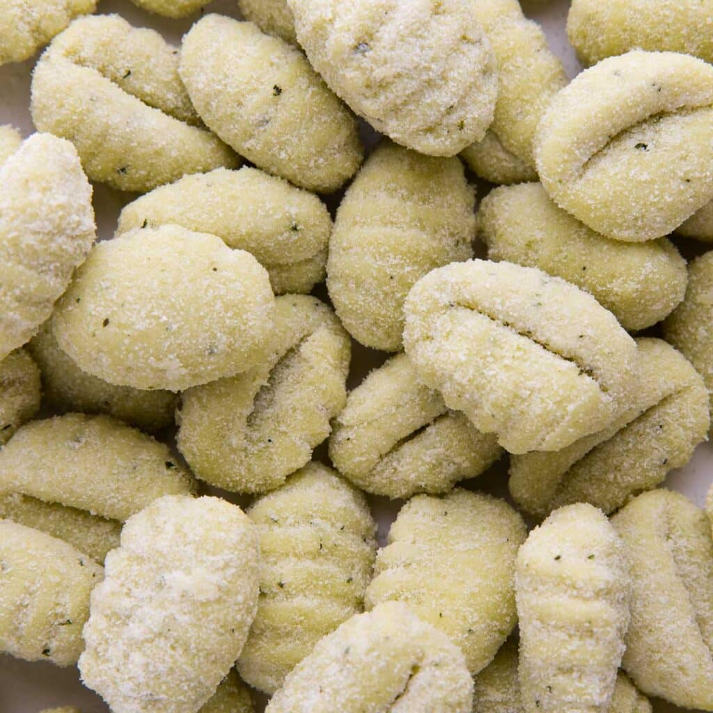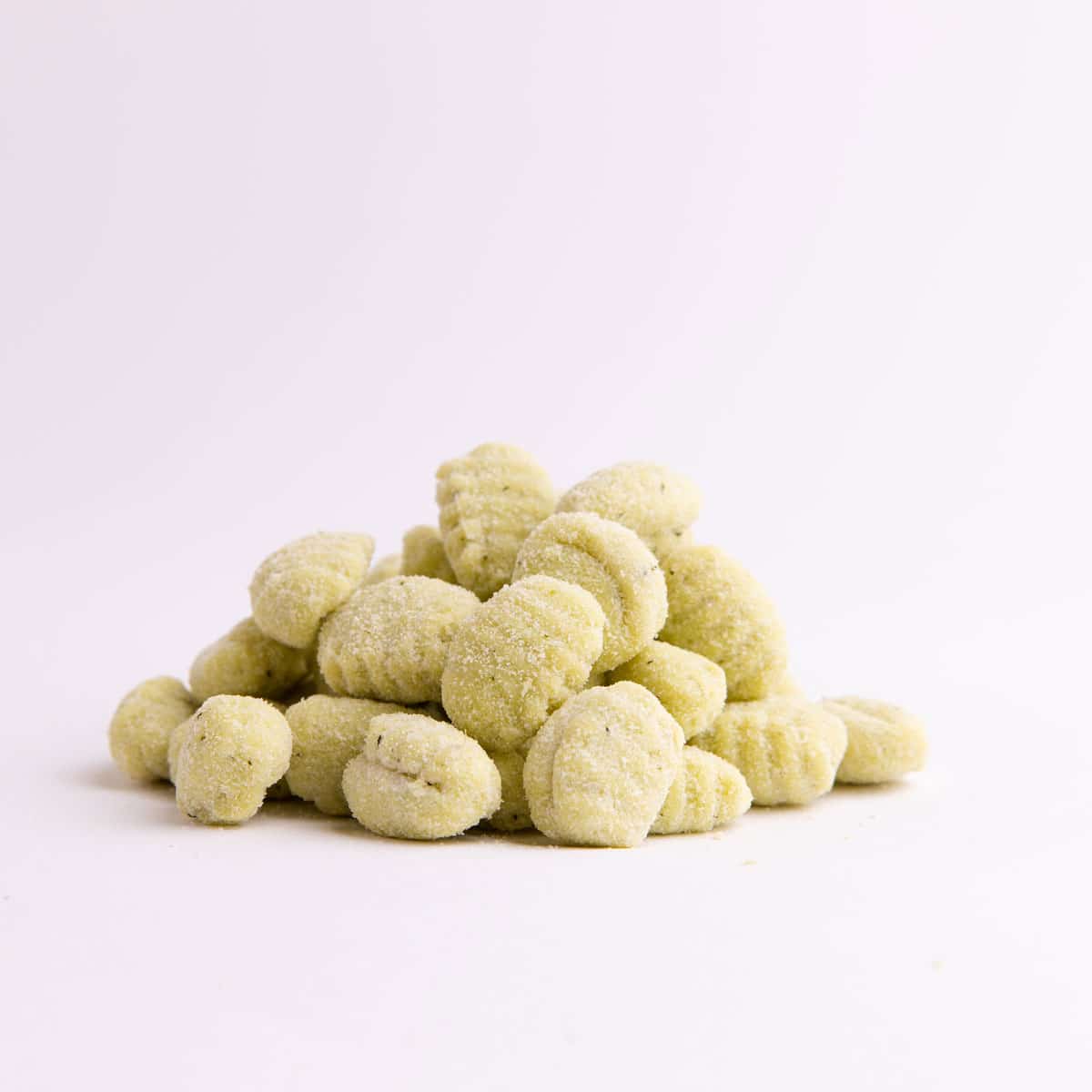 Pronto gnocco 46.7% (farina di patate 64% (patate, emulsionanti: amidi(contengono glutine), sale, farina di grano tenero, aroma naturale), acqua, basilico sott`olio 4.7% (basilico, olio di semi di girasole, sale, acido ascorbico), semolino di riso