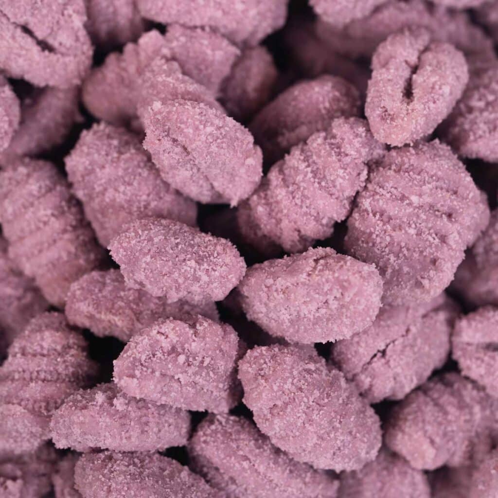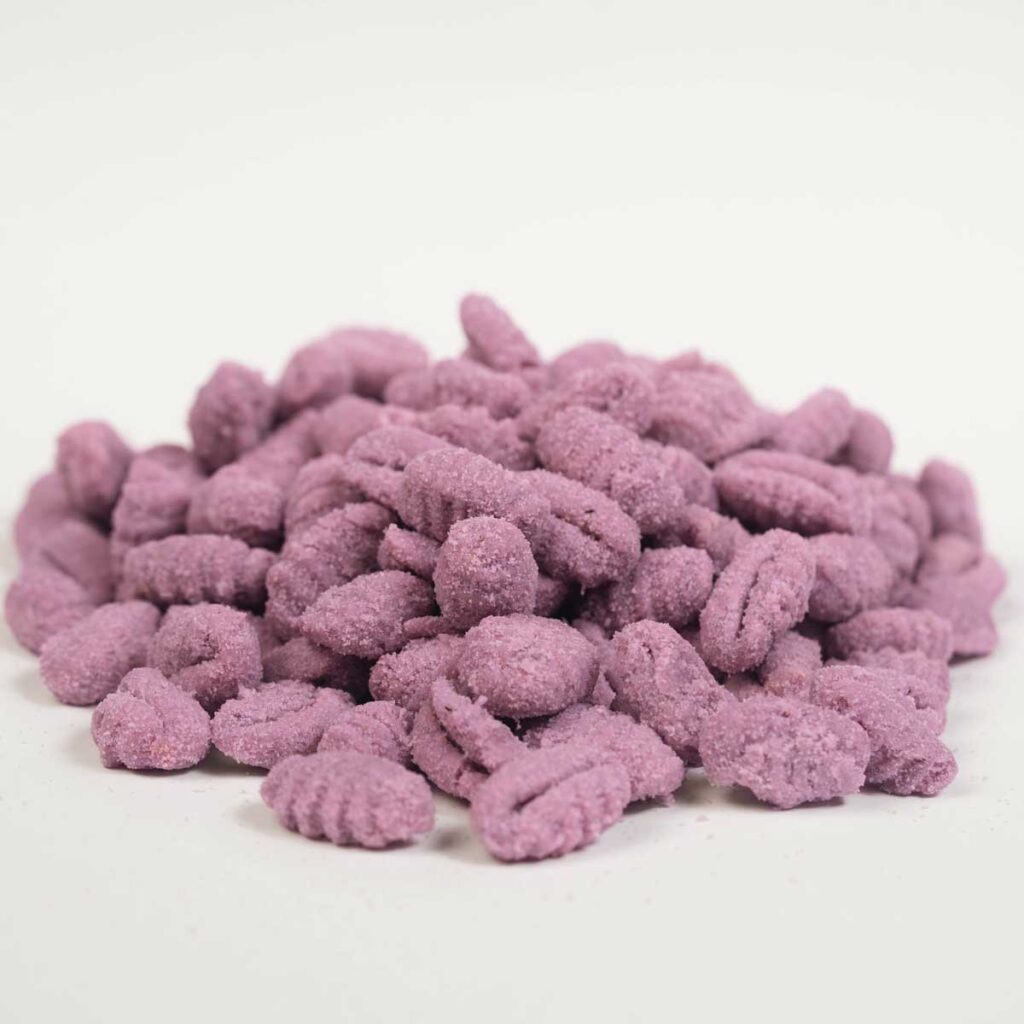 Preparato per gnocchi viola (49,0%) (farina di patate, amido di mais, farina di patate viola (15,0%) (patate viola, emulsionanti: mono- e digliceridi degli acidi grassi, antiossidante: palmitato di ascorbile), amido di grano tenero, sale, farina di grano tenero, estratto di carota viola), acqua, semolino di riso.