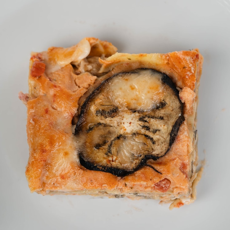 pomodori pelati, melanzane 21.6%, latte, acqua, semola di grano duro, mozzarella (latte vaccino pastorizzato, sale, fermenti, caglio, citrato di sodio, acido citrico, sorbato di potassio), manitoba farina, olio di girasole, uova fresche, burro, farina tipo “”00″”, cipolle, formaggio vaccino stagionato, sale da cucina, basilico sott`olio (basilico, olio di semi di girasole, sale, acido ascorbico), crema di riso, addensante (amido modificato, destrosio), zucchero, tuorlo d’uovo in polvere, spezie