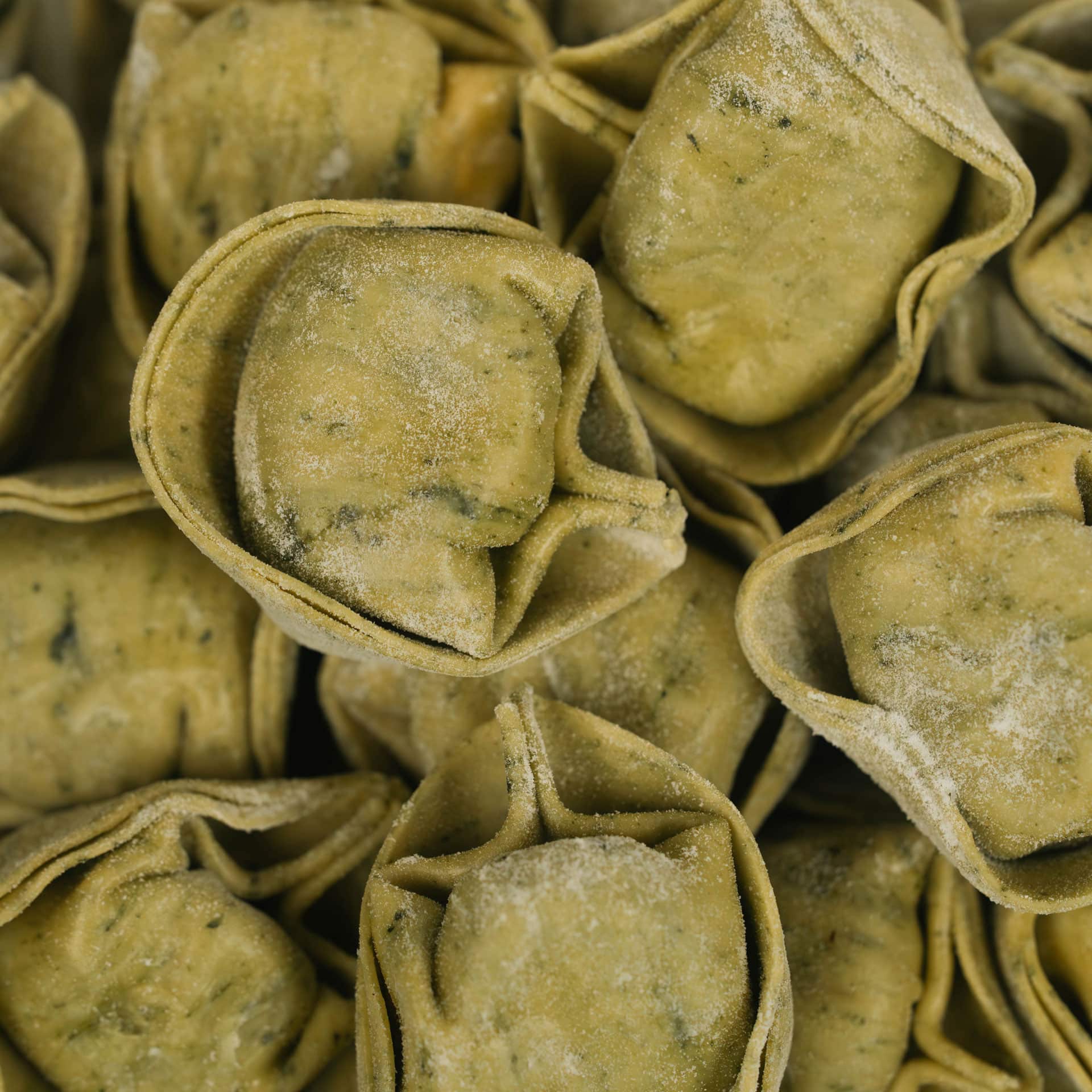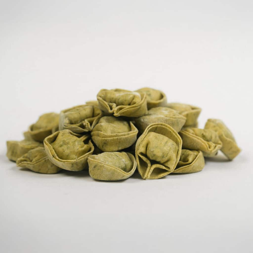 Formaggio vaccino stagionato, granito di grano tenero, semola di grano duro, mozzarella 9.8% (latte vaccino pastorizzato, sale, fermenti, caglio, citrato di sodio, acido citrico, sorbato di potassio), misto uovo, ricotta 5.2% (siero di latte, latte, sale, acido citrico), spinaci 4.9%, pane grattugiato (farina di grano tenero tipo “0”, acqua, sale, lievito di birra, farina di frumento maltato), acqua, crema di riso, siero di latte in polvere, spinaci secchi in polvere, sale da cucina, spezie.